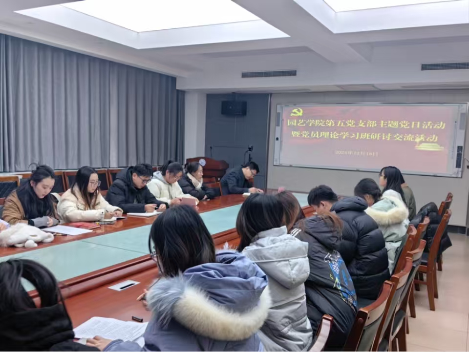 12月18日,园艺学院第五党支部召开主题党日活动暨党员理论学习班研讨交流活动,会议由党支部书记刘凝主持,第五党支部全体党员参会,学院党委副书记孙海涛到会指导。