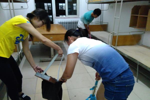 在打扫的过程中,大家齐心协力、互帮互助,他们对书橱、风扇、床板,地板等进行了全方位的清扫。事无巨细,每个同学都十分认真。在打扫过程中,由于风扇的位置偏高,很多女同学受力量和身高限制无法擦拭,于是很多男同学便当仁不让地承担起这一重任。他们不嫌脏不嫌累地将风扇从里到外擦了一遍,将每一片扇片都擦得一尘不染。经过两天的清扫工作,终于将男女新生宿舍打扫干净。
