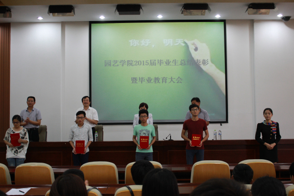 为给我院2015届毕业生精彩的大学生活划上圆满句号,园艺学院于6月26日上午十点在学术会馆第二报告厅召开“你好,明天”2015届毕业生总结表彰暨毕业教育大会。我院分党委书记刘培利、院长王然、分党委副书记梁永平、副院长刘成连及学工办老师出席了本次大会,大会由分党委副书记梁永平主持。